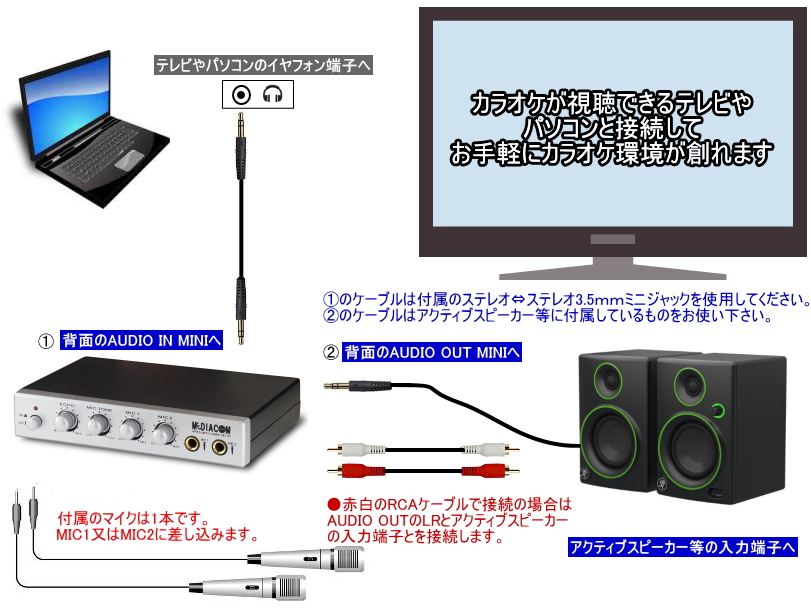カラオケが視聴出来る状態のテレビやパソコンと接続すれば、低予算でカラオケの環境が創れます。